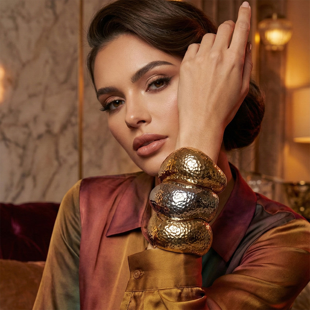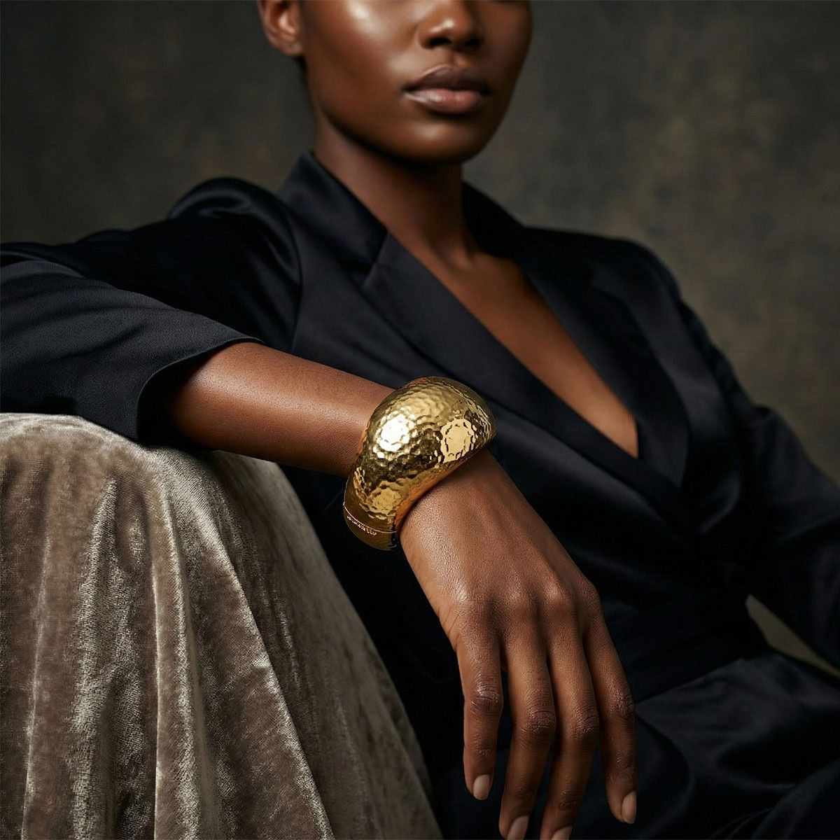 Women's Bangle Bracelet. Fashion Forward Contemporary Thick Chunky Hammered Texture Gold Metal Bangle Bracelet Featuring Wavy Shape Design. Hinge Closure. Bangle Inner Diameter Measures 2.5 inches. 10 inches Exterior Circumference. 1.5 inches Wide. Perfect for Stacking and Layering!