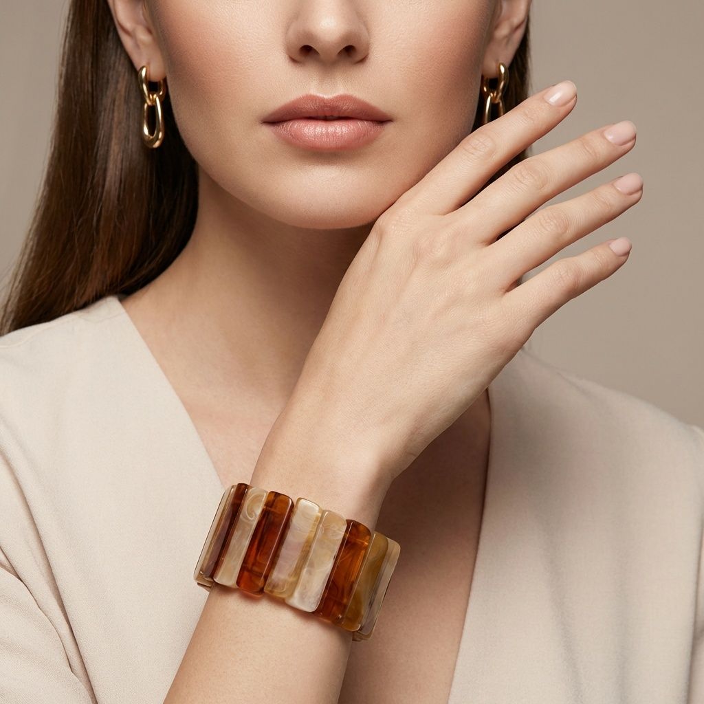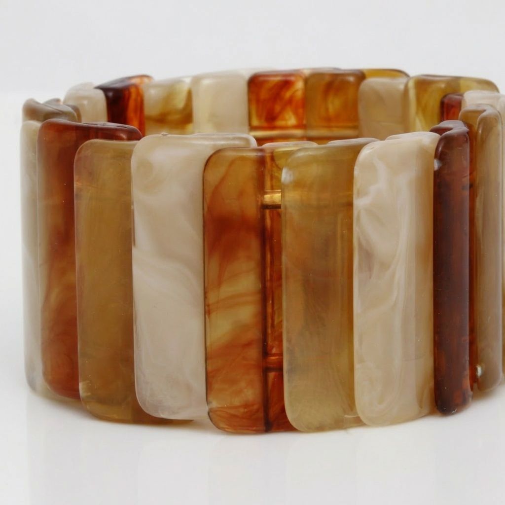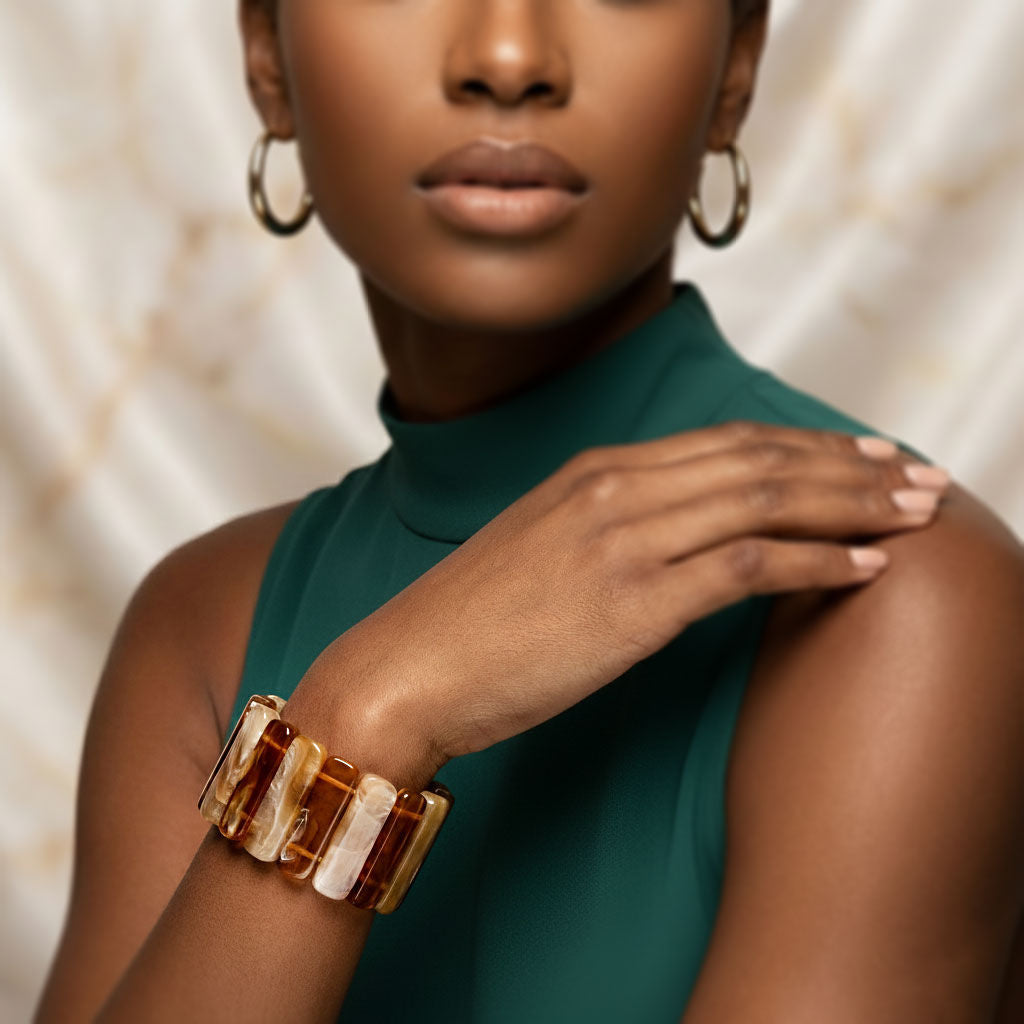 Women's Stretch Cuff Bracelet. Vintage-Style Artistic Marbled Tortoiseshell Brown, Medium Caramel Brown, and Tan Resin Rectangular Stacked Disc Stretch Bracelet. Bracelet Measures 1.5 inches wide. Neutral Natural Beauties Perfect for Stacking and Layering!