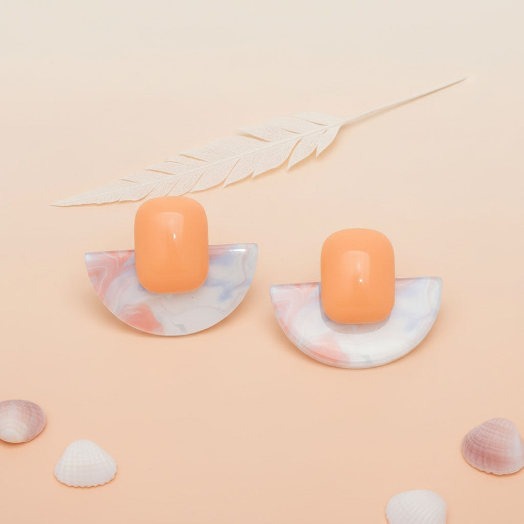 Women's Stud Earrings. Funky Retro Throwback Style Coral Acrylic with Dynamic Swirled Pink, White, and Blue Semi Circle Acrylic Stud Earrings. Bold, Vibrant, and Retro. Post Backing.