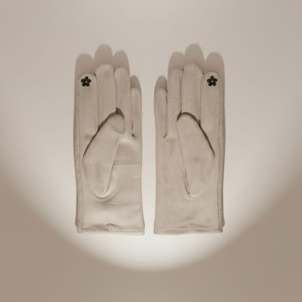 Women's Winter Gloves. Warm Soft Wool Like Beige Touchscreen Winter Gloves Featuring Faux Suede Palm Underside and Whimsical Cute Rabbit Detail. Smartphone Friendly. Warm and Insulating Fleece Lined Interior. Stretch to Fit. One Size. Gloves Measure 9.25 inches Long. 60% Polyester and 40% Acrylic.