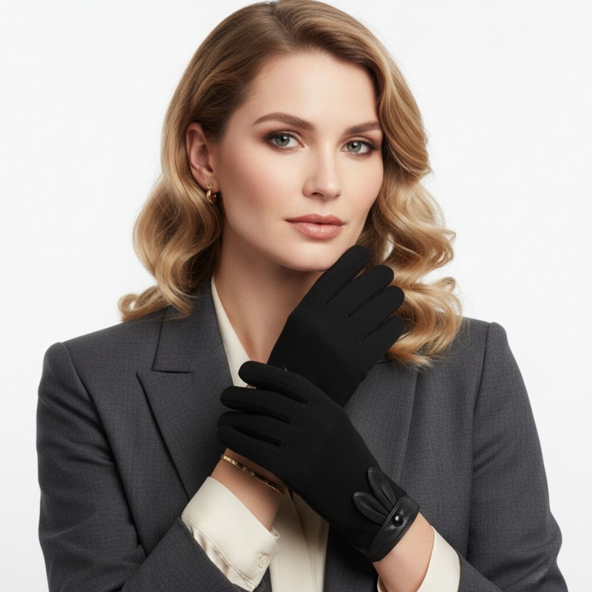 Women's Winter Gloves. Warm Black Touchscreen Winter Gloves Featuring Faux Leather Bunny Ear and Button Detail. Smartphone Friendly. Warm and Insulating Fleece Lined Interior. Stretch to Fit. One Size. Gloves Measure 9.25 inches Long. 60% Polyester and 40% Acrylic.