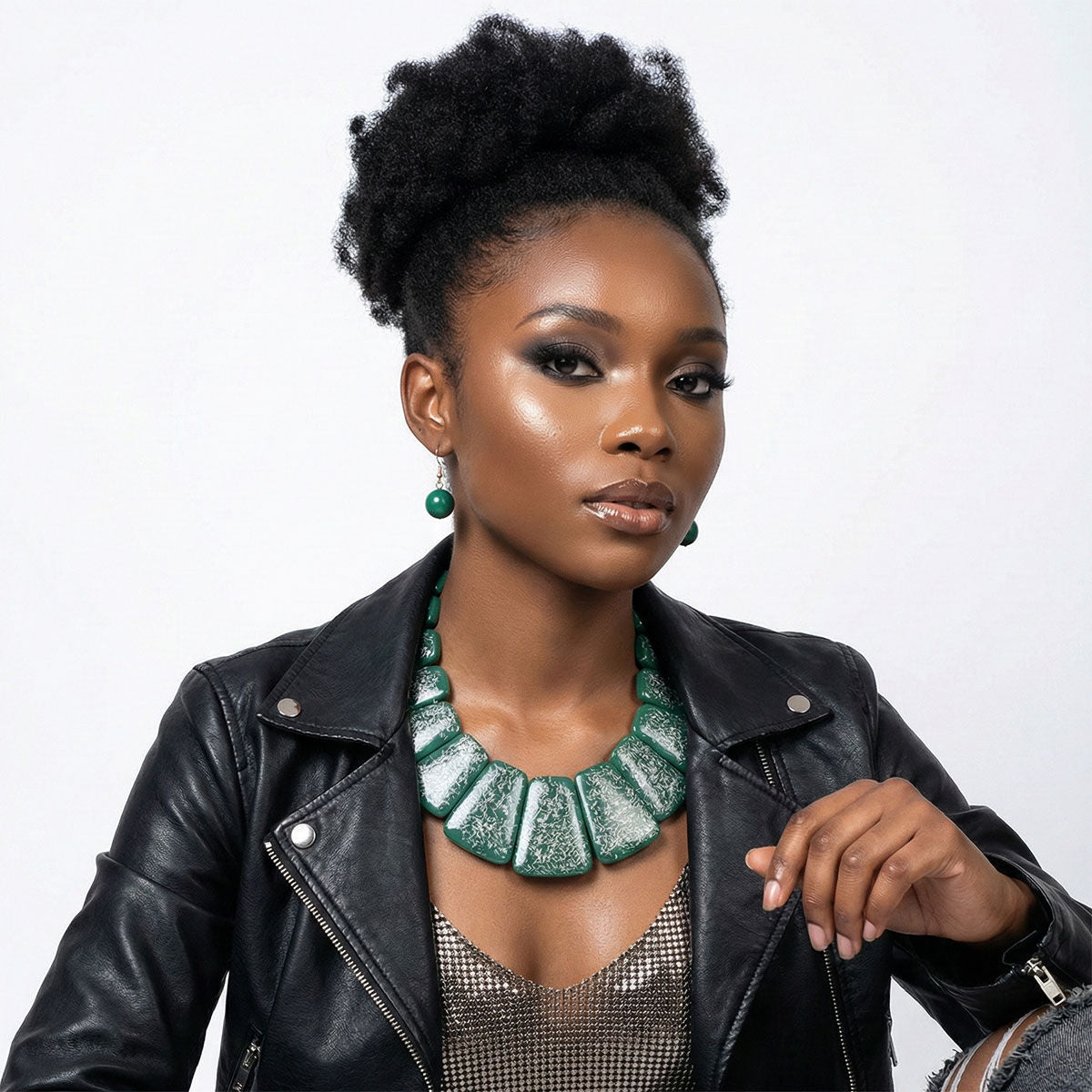 Women's Bib Necklace Set. Show-stopping Tribal Bib Collar Necklace Comprised of Large Graduated Green Trapezoid Shaped Resin Pieces Featuring Silver Shredded Confetti Inlay Detailing. Lobster Clasp Closure. Bib Measures 1 inch and Neckline to 2.65 inches wide in Center. Includes Matching Fish Ball Bead Drop Earrings.