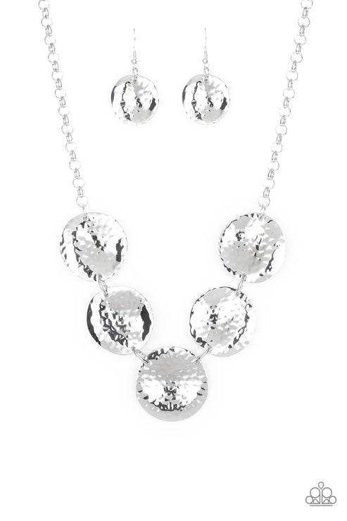 Featuring a hammered high-sheen finish, imperfect round silver frames link below the collar for a casual look. Features an adjustable clasp closure.
