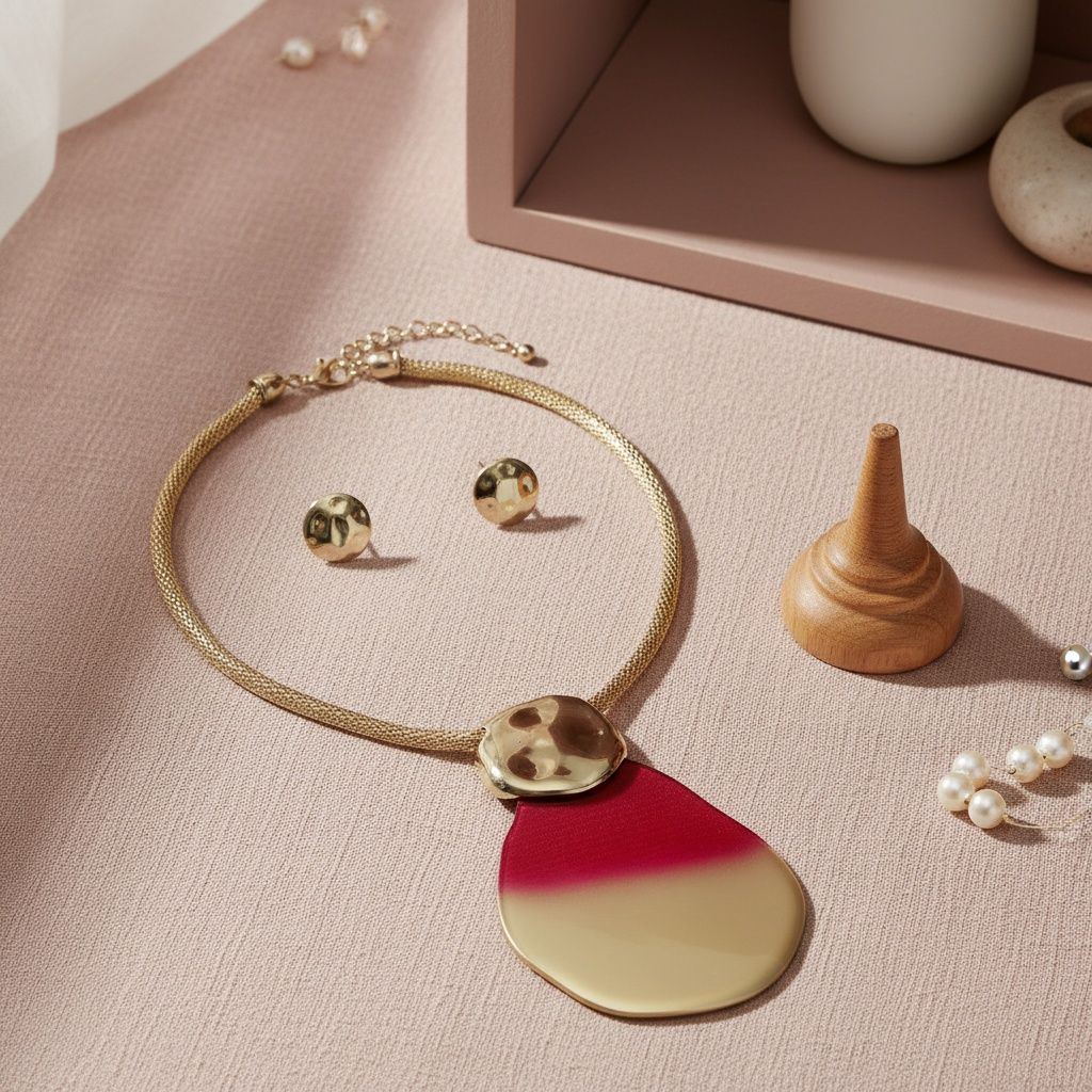 Women's Pendant Necklace Set. Bold Artisan Style Necklace Featuring Hollow Gold Metal Mesh Chain with Large Slide Pendant Comprised of Hammered Gold Acrylic with Fuchsia Pink to Gold Ombre Organic Teardrop Shaped Acrylic Detail. Pendant Measures 4.65 inches x 3.15 inches. Lobster Clasp Closure. Includes Matching Hammered Disc Stud Post Backing Earrings.