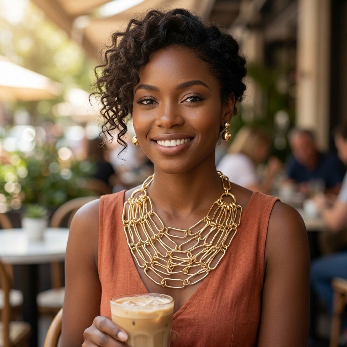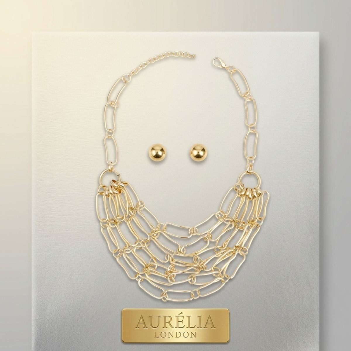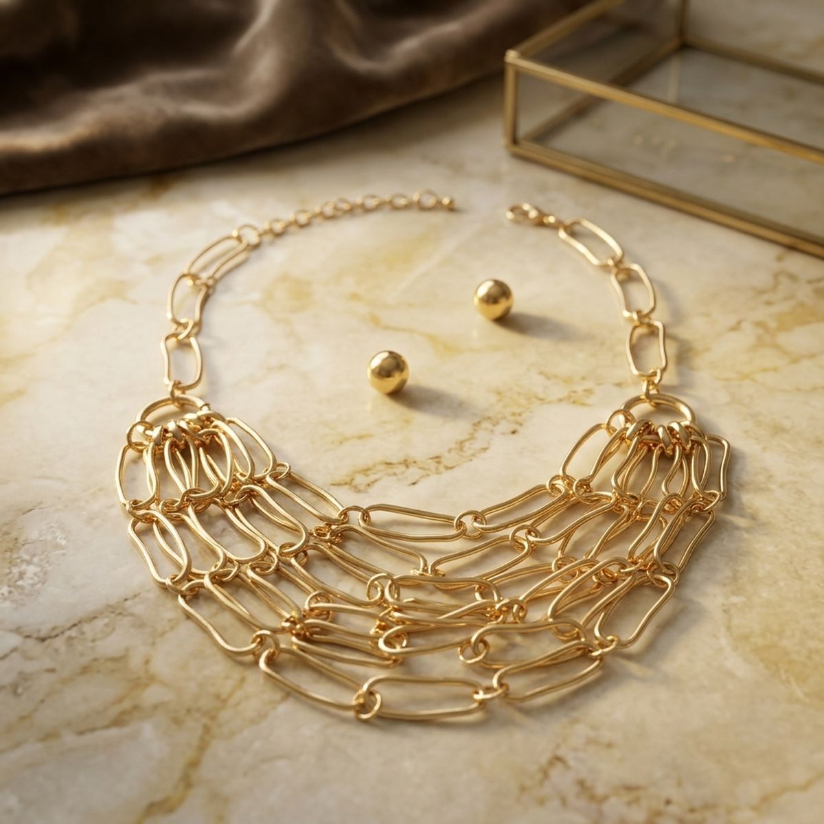 Women's Chain Necklace Set. Draped Design Gold Metal Elongated Oval Bean-Like Shaped Link Necklace Featuring 6 Levels of Draped Chains that Create a Bib Like Effect. Each Link Measures 1.25 inches long. Approx 4 inch Drop at Center. Lobster Clasp Closure. Includes Ball Post Backing Stud Earrings.