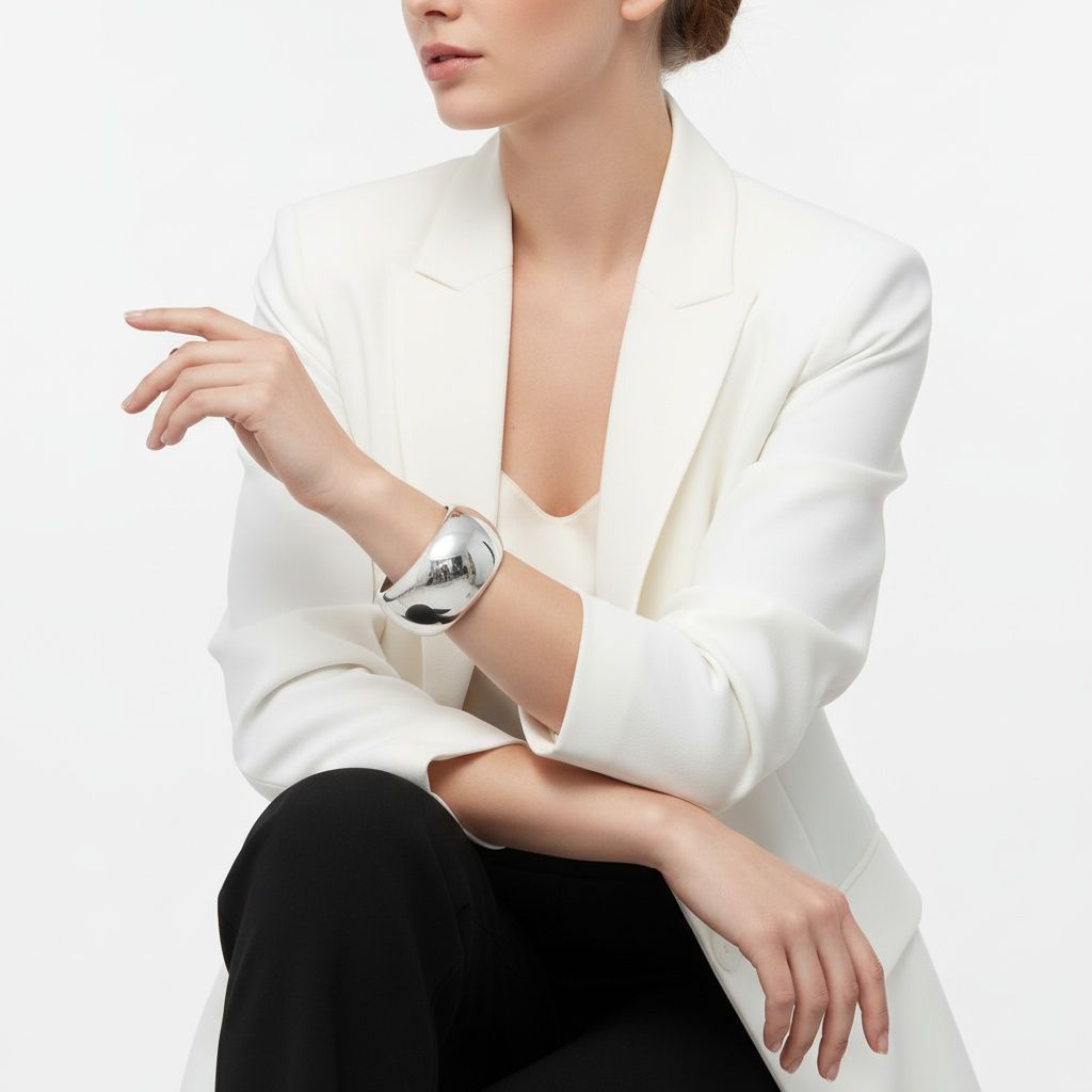 Women's Bangle Bracelet. Runway Ready High Shine Wide Polished Silver Metal Bangle Bracelet Featuring Oval Shape Bangle Design. Hinge Closure. Bangle Inner Diameter Measures 2.35 inches. 9.35 inches Exterior Circumference. 1.5 inches Wide. Perfect for Stacking and Layering!