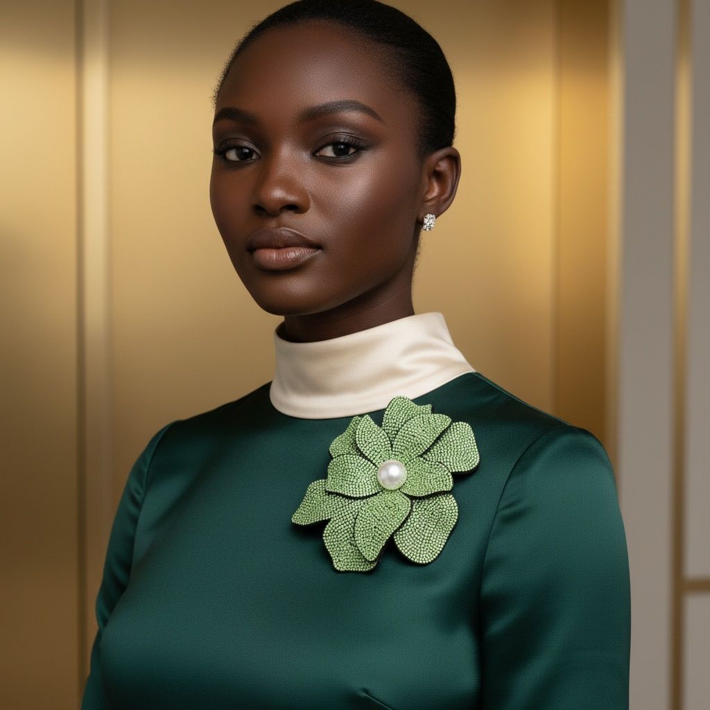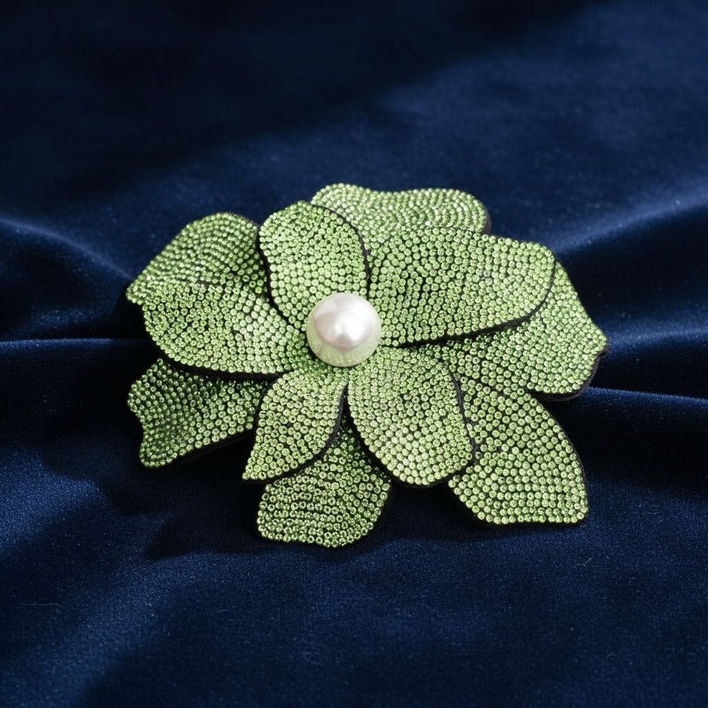 Women's Brooch Pin and Hair Clip. Large Sparkling Handcrafted Brilliance 3D Green Rhinestone Layered Petal Flower Featuring Black Felt Backing and Acrylic Pearl Center. Safety Pin Hook Closure. Also Features Metal Alligator Hair Clip. Can be Worn as Brooch or Hair Clip. Handmade.
