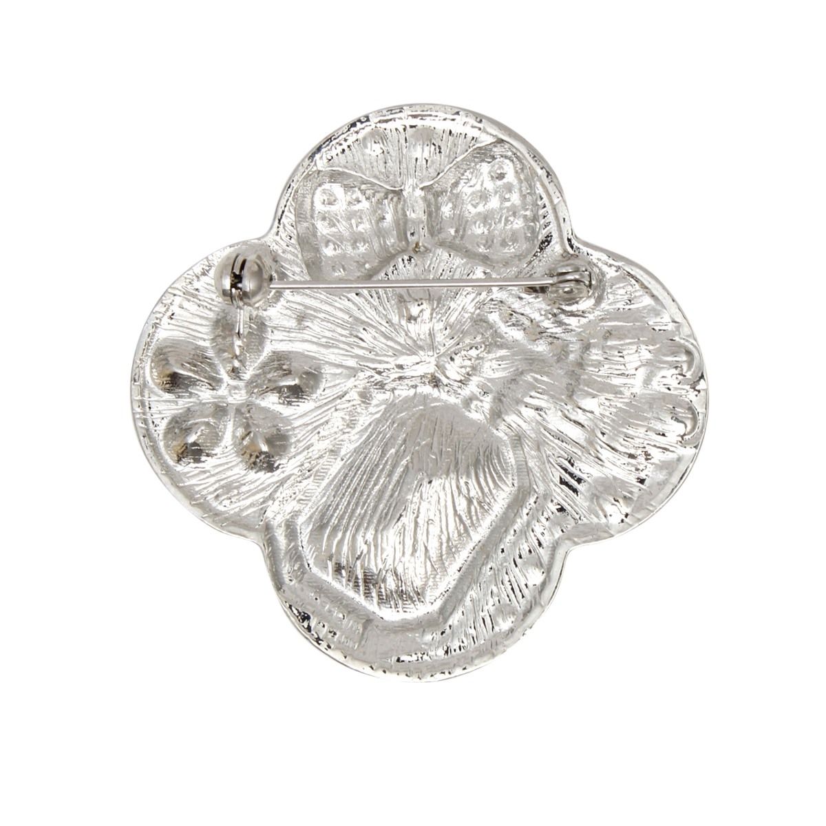 Women's Brooch Pin. Couture Statement Silver Metal with Green Enamel Clover Shaped Brooch Featuring Pink Glass Crystal Perfume Bottle Accent, Rhinestone Bow, Crystal Flowers, and Pearl Stud Detailing. Safety Catch Pin Closure. Perfect for AKA Sorors!