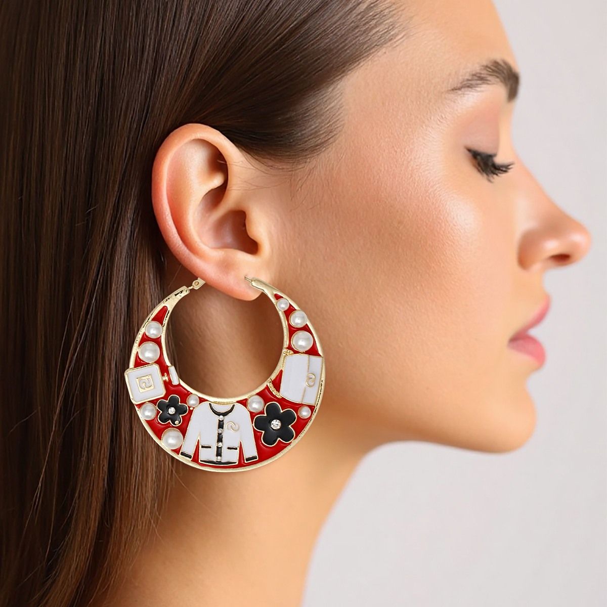 Women's Hoop Earrings. Fashion House Chic Gold Metal Moon Shaped Hoop Earrings with Red Enamel Featuring White and Black Parisian Iconic Luxury Motifs and Pearl Stud Detailing. Omega Hoop Closure.