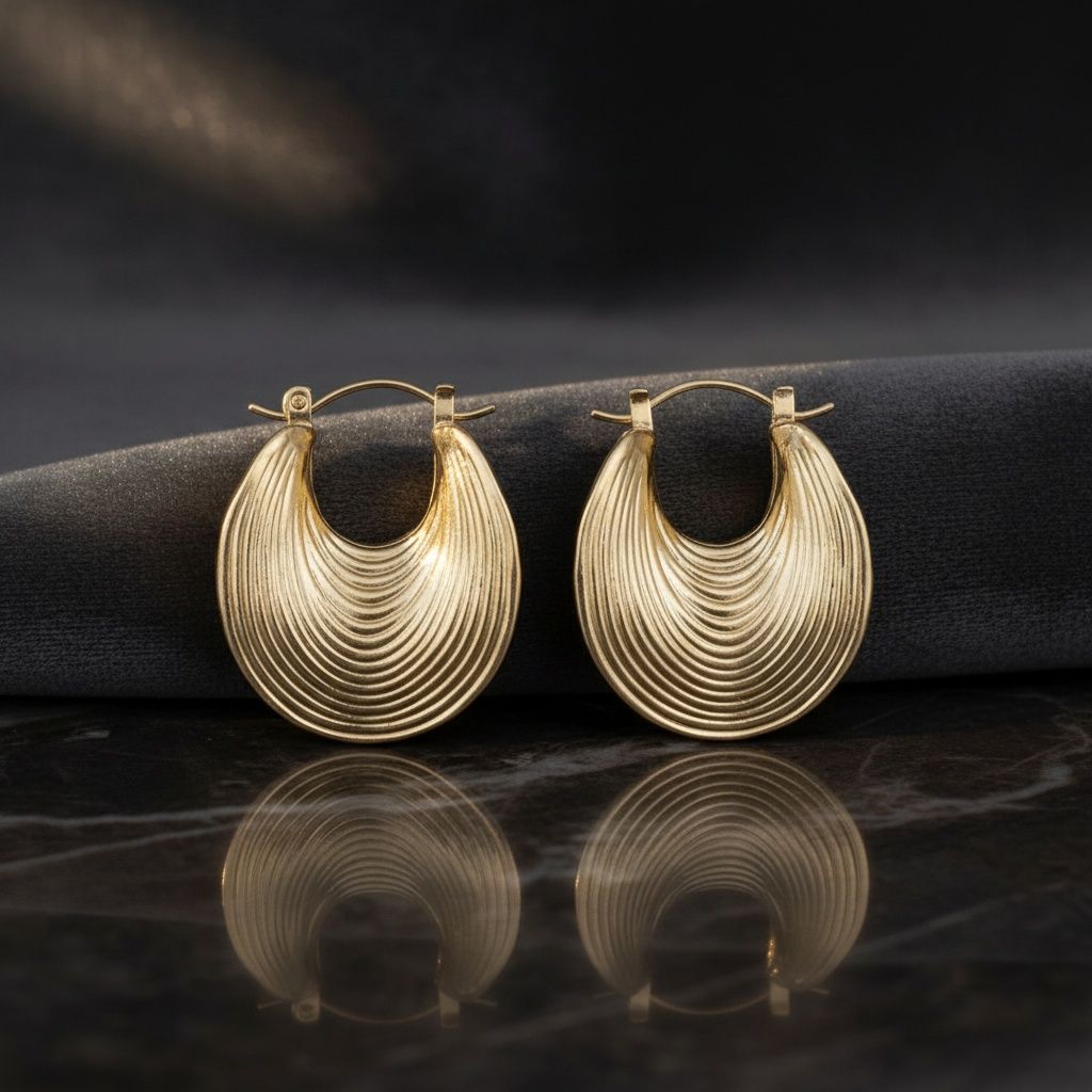 Women's Hoop Earrings. Modern Twist on a Classic Gold Metal Striped Texture Wide Hoop Earrings Featuring Saddle-Like Shape Design. Latch Closure.