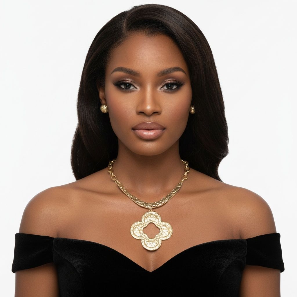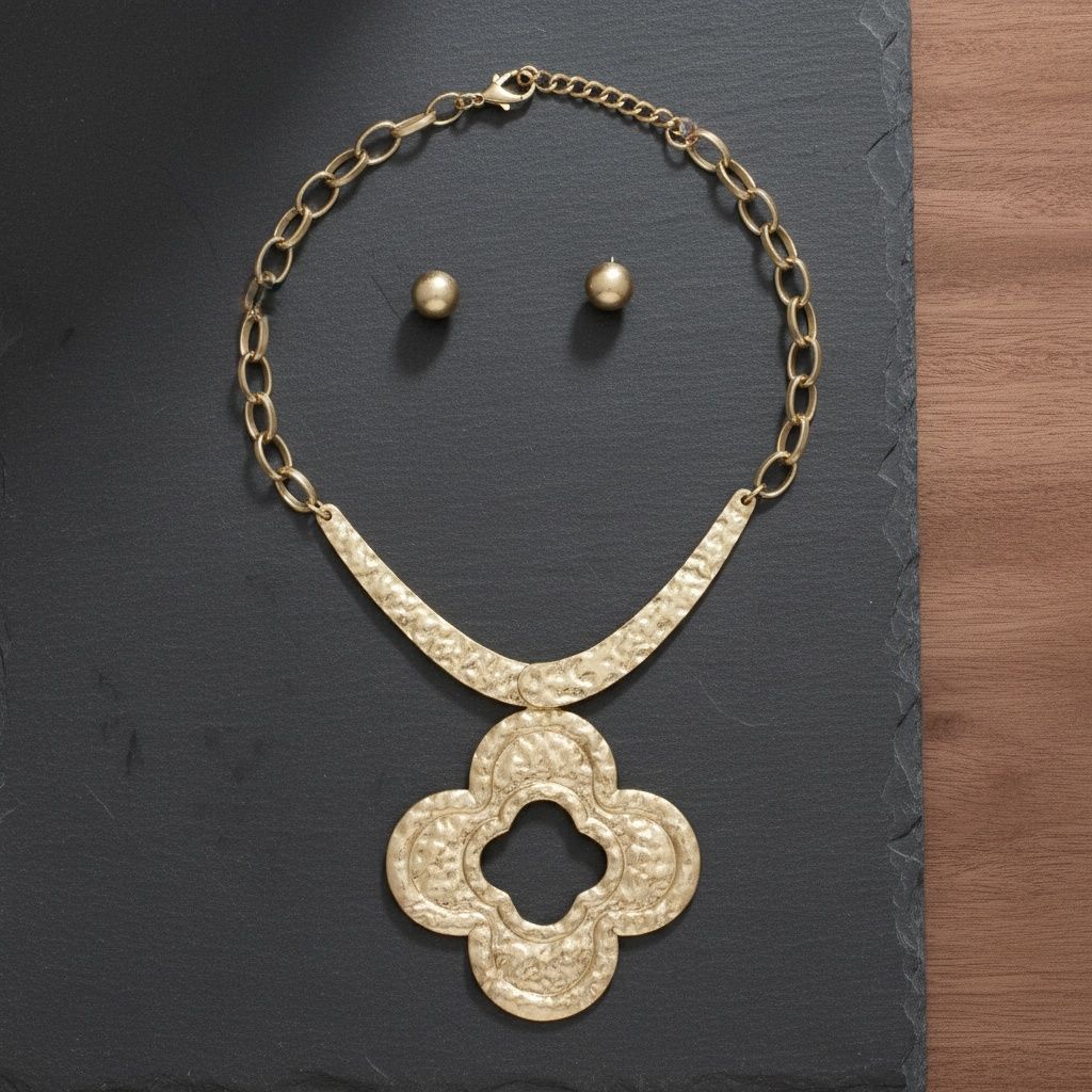 Women's Pendant Necklace Set. Chunky Oval Link Matte Gold Metal Chain Necklace with Rigid Hammered Matte Gold Metal Center Collar Featuring Large Hammered Matte Gold Metal Quatrefoil Clover Pendant. Pendant Measures 3.5 inches. Rigid Collar Plate Measures .5 inches wide at Center and Has U Shaped Design with 2.5 inch Drop. Lobster Clasp Closure. Includes Domed Post Backing Stud Earrings.
