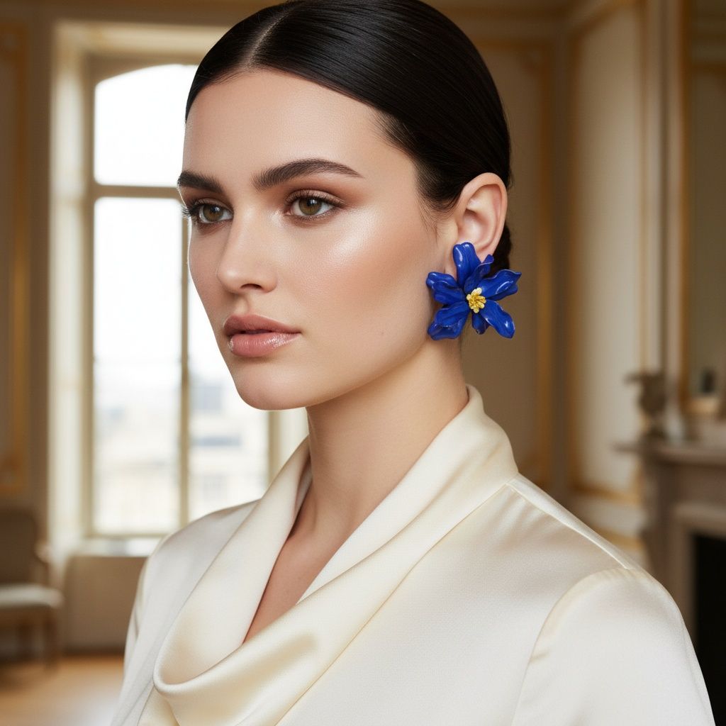 Women's Stud Earrings. Floral Statement Oversized Stud Earrings Featuring Large Dimensional Wavy Acrylic Petals in Vibrant Blue with an Orange and Yellow Beaded Center. Bold and Eye-Catching Floral Playful Elegance. Earrings Measure 4.25 inches and 2.25 inches Tall. Post Backing.