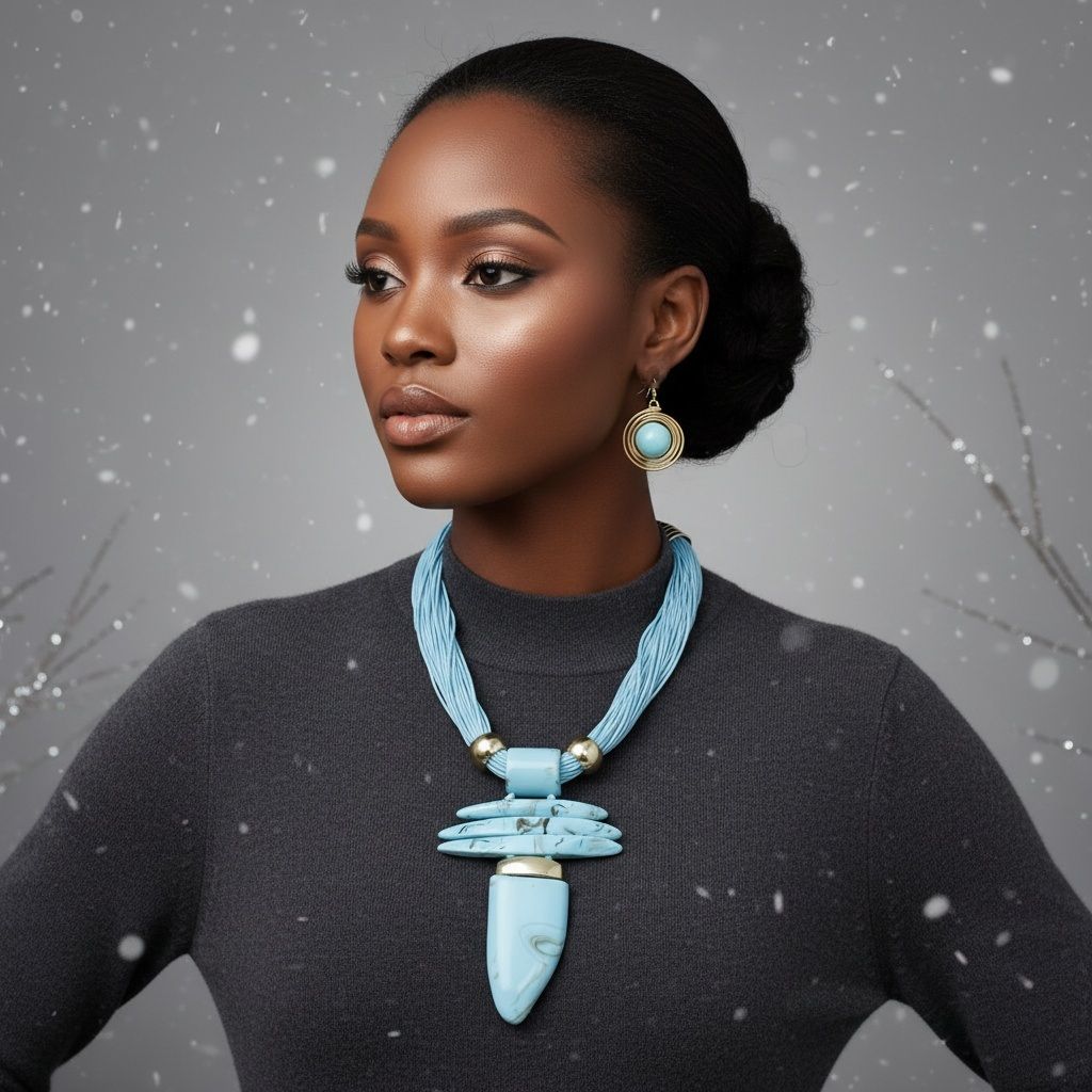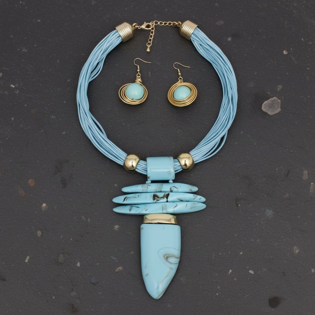 Women's Tribal Pendant Necklace Set. Bold 36 Strand Turquoise Faux Leather Cord Necklace Featuring a Large, Chunky Marbled Turquoise and Brown Resin Slide Pendant Showcasing a Natural Tribal Inspired Design with Long Triple Stacked Resin Pieces and Dramatic Horn Shape Detail. Full Pendant Measures 6 inches x 4 inches. Gold Metal Lobster Clasp Closure. Includes Coiled Gold Metal Wire Wrapped Marble Bead Fish Hook Earrings Measuring 2.5 inches x 1.25 inches.