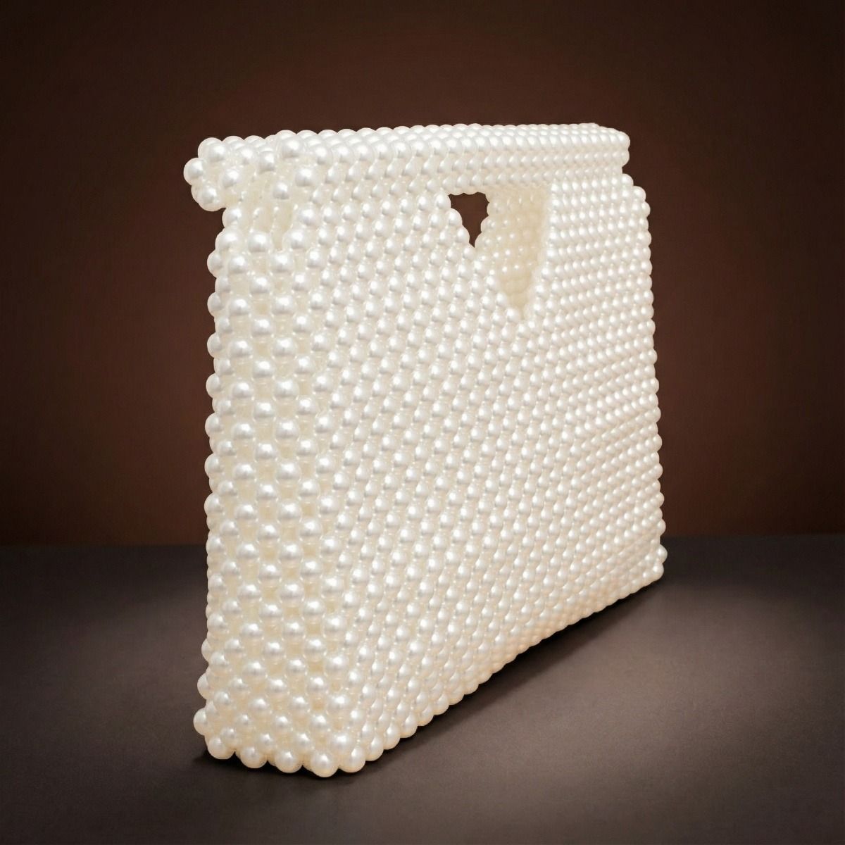 Women's Handmade Pearl Clutch Bag. Woven Acrylic Cream Pearl Structured Silhouette Open Top Clutch Bag Featuring Built In Triangular Cut Out and Thick Rounded Handle. Elegant Evening Bag Perfect for Formal Events and Weddings.