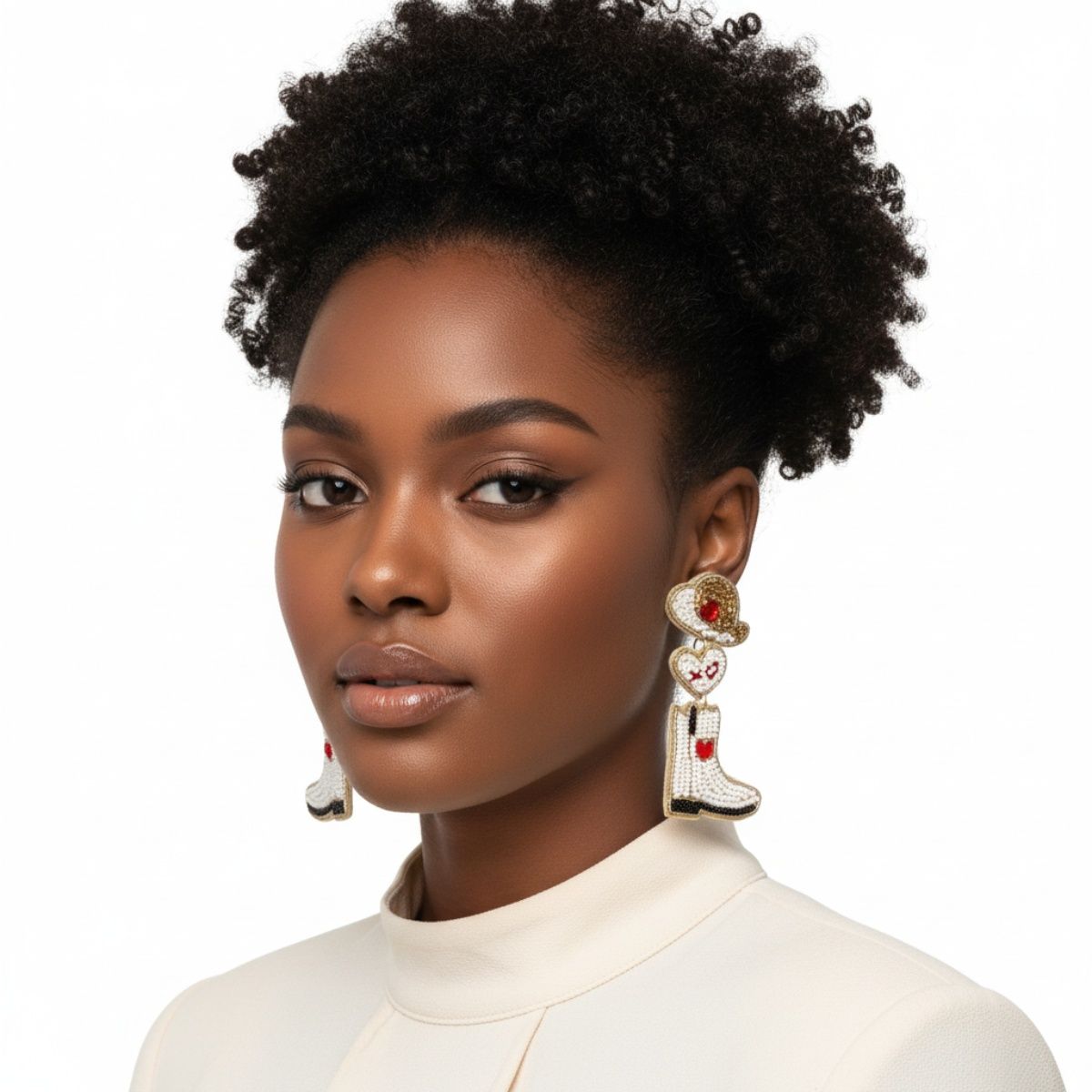 Women's Dangle Earrings. Western Wear Cowboy Hat, XO Heart, and Cowboy Boot Dangle Earrings Featuring White and Red Embroidered Bead Detail, Gold Trim, and Red Rhinestone Heart. Post Backing.